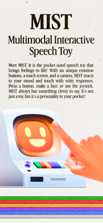 MIST adalah mainan bicara ukuran saku yang dirancang untuk mengekspresikan berbagai emosi. Dengan enam tombol emosi yang unik, layar sentuh, dan kamera, MIST mampu merespons mood dan sentuhan pengguna dengan jawaban yang cerdas dan lucu. Pengguna dapat menekan tombol, membuat wajah, atau menggunakan joystick untuk berinteraksi dengan MIST. Setiap interaksi memberikan pengalaman yang menyenangkan dan menghibur, menjadikan MIST lebih dari sekadar mainan biasa.